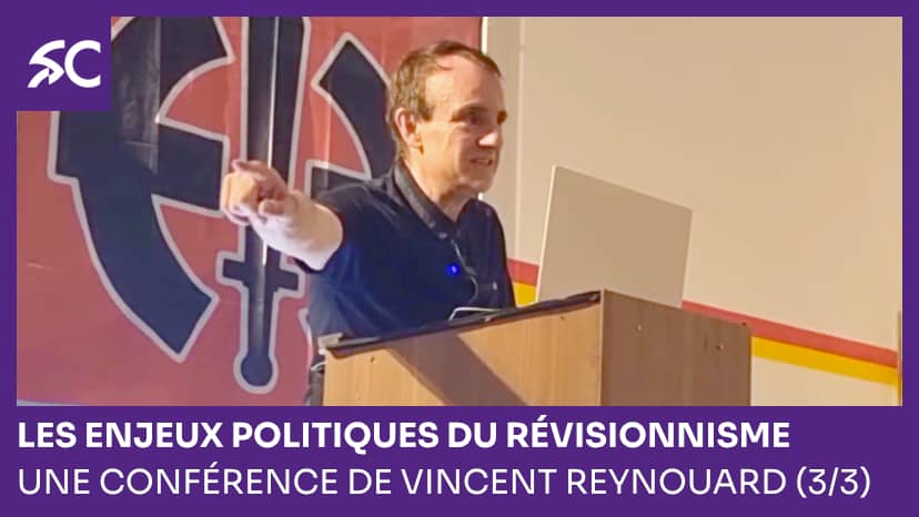 Dans cette dernière partie, Vincent Reynouard se fonde sur des documents pour démontrer que la « Mémoire » est exploitée afin d’embrigader les jeunes générations sous la bannière de l’antifascisme, en leur inculquant l’idéologie mondialiste. Sa conclusion est claire: tant que le spectre de la Shoah planera sur nos sociétés, aucune renaissance nationale ne sera possible. La version de la conférence que le Blogue SC vous propose ici a été enrichie par Vincent Reynouard lui-même qui l’a complétée en y faisant apparaître à l’écran les documents qu’il cite dans sa conférence (avec les passages entourés ou surlignés).