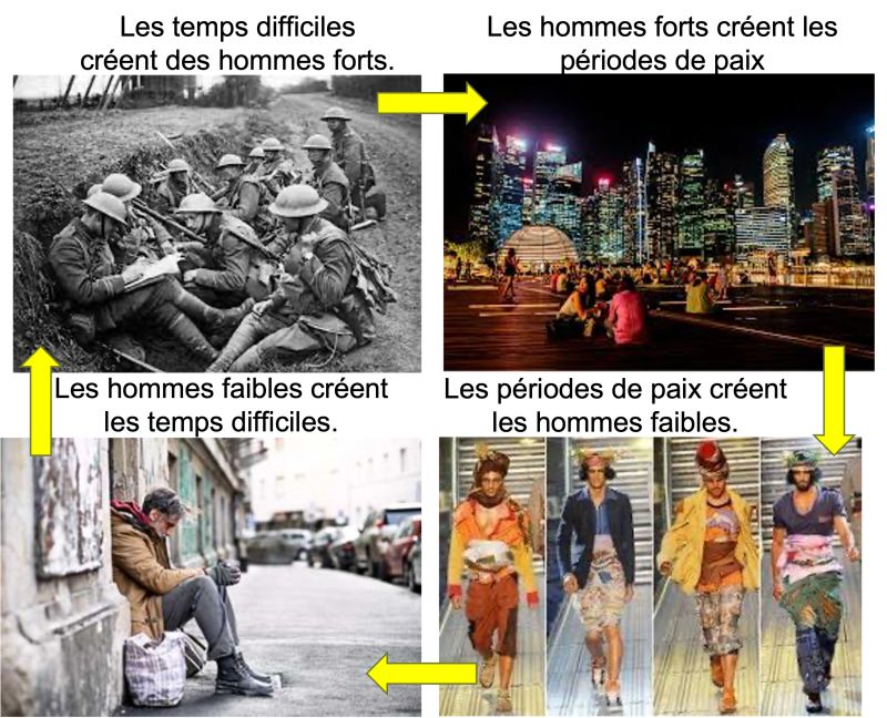 Certes, cette maxime est criante de vérité : « Les temps difficiles créent des hommes forts – les hommes forts créent les périodes de paix – les périodes de paix créent les hommes faibles – les hommes faibles créent les temps difficiles«
